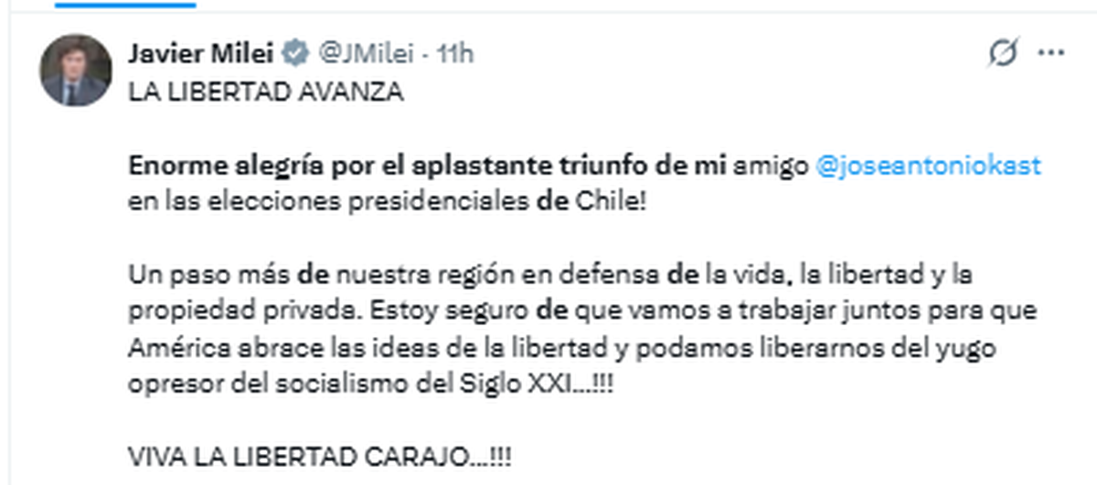 Jara reconoció su derrota poco más de una hora y media después de que cerraran las urnas. "La democracia habló fuerte y claro. Me acabo de comunicar con el Presidente electo @joseantoniokast para desearle éxito por el bien de Chile", dijo en un post en X.